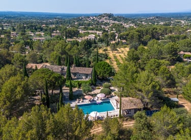 ce très beau mas restauré, disponible à la location toute l'année, bénéficie d'une vue dominante sur le vieux village, les Alpilles et le Mont Ventoux. Il allie le confort moderne et l'esprit provençal par le raffinement de sa décoration. D'agréables terrasses s'ouvrent sur 1, 3 ha de parc. Avec piscine protégée.